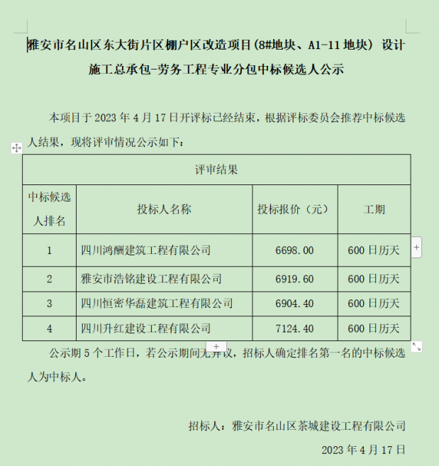 雅安市名山區東大街片區棚戶區改造項目(8#地塊、A1-11地塊) 設計施工總承包-勞務工程專業分包中標候選人公示